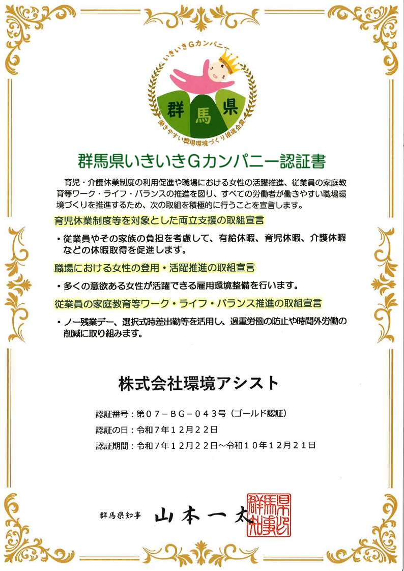 「群⾺県いきいきGカンパニー」【ゴールド認証】取得のお知らせ 環境アシストは、群⾺県より、育児・介護と仕事の両⽴、職場における⼥性の活躍推進、従業員のワーク・ライフ・バランスの推進等に先導的に取り組む事業所として「群⾺県いきいきGカンパニー」【ゴールド認証】を取得しています。 詳しくはこちら >