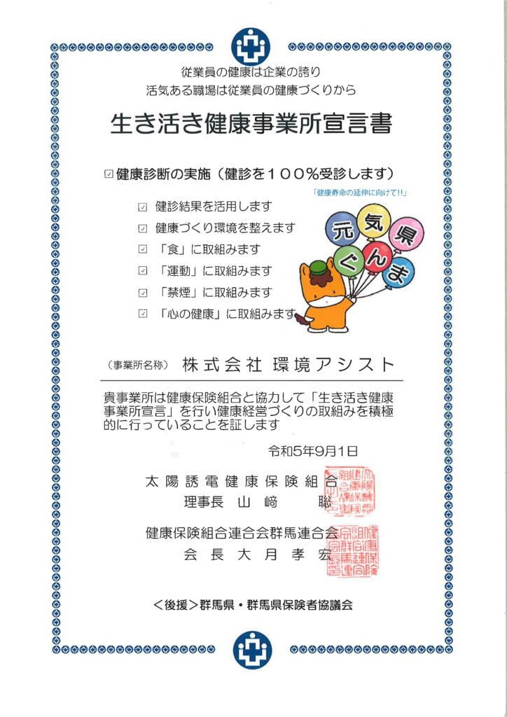 「生き活き健康事業所宣言」 当社は、従業員一人ひとりが心身ともに健康で、活き活きと能力を発揮できる職場づくりを目指し、健康経営を積極的に推進しています。 この度、その取り組みの一環として、当社の加入する太陽誘電健康保険組合が掲げる「生き活き健康事業所宣言」に則り、当社の健康づくりの目標と行動を改めて明確化いたしました。 今後も、太陽誘電健康保険組合と連携し、従業員とその家族の健康保持・増進に向けた具体的な施策を展開し、企業価値向上に努めてまいります。