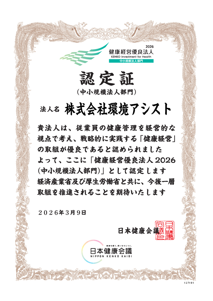 「健康経営優良法人2026(中小規模法人部門)」に認定されました。 環境アシストは、経済産業省と日本健康会議が共同で選定する 「健康経営優良法人2026(中小規模法人部門)」に認定されました。従業員とその家族の健康管理と幸福を経営的・戦略的な視点で考え、「健康経営」を実践しています。これからも従業員をはじめとしたステークホルダーからの期待に応え、太陽誘電グループの一員として社会的責任を果たすことで、信頼獲得と社会価値向上に取組んでいきます。